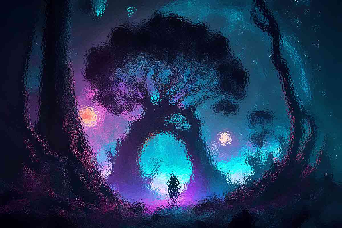 Fantastic floating islands with magic mushroom at night. Vector game background with cartoon illustration of fantasy landscape of flying in air platforms with shiny fly agaric